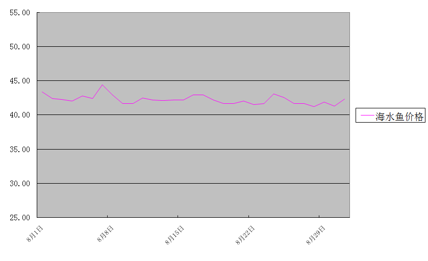 大帶魚、大黃花魚兩種海水魚批發(fā)均價為42.23元/公斤,環(huán)比下降1.6%,同比上升7.2%。